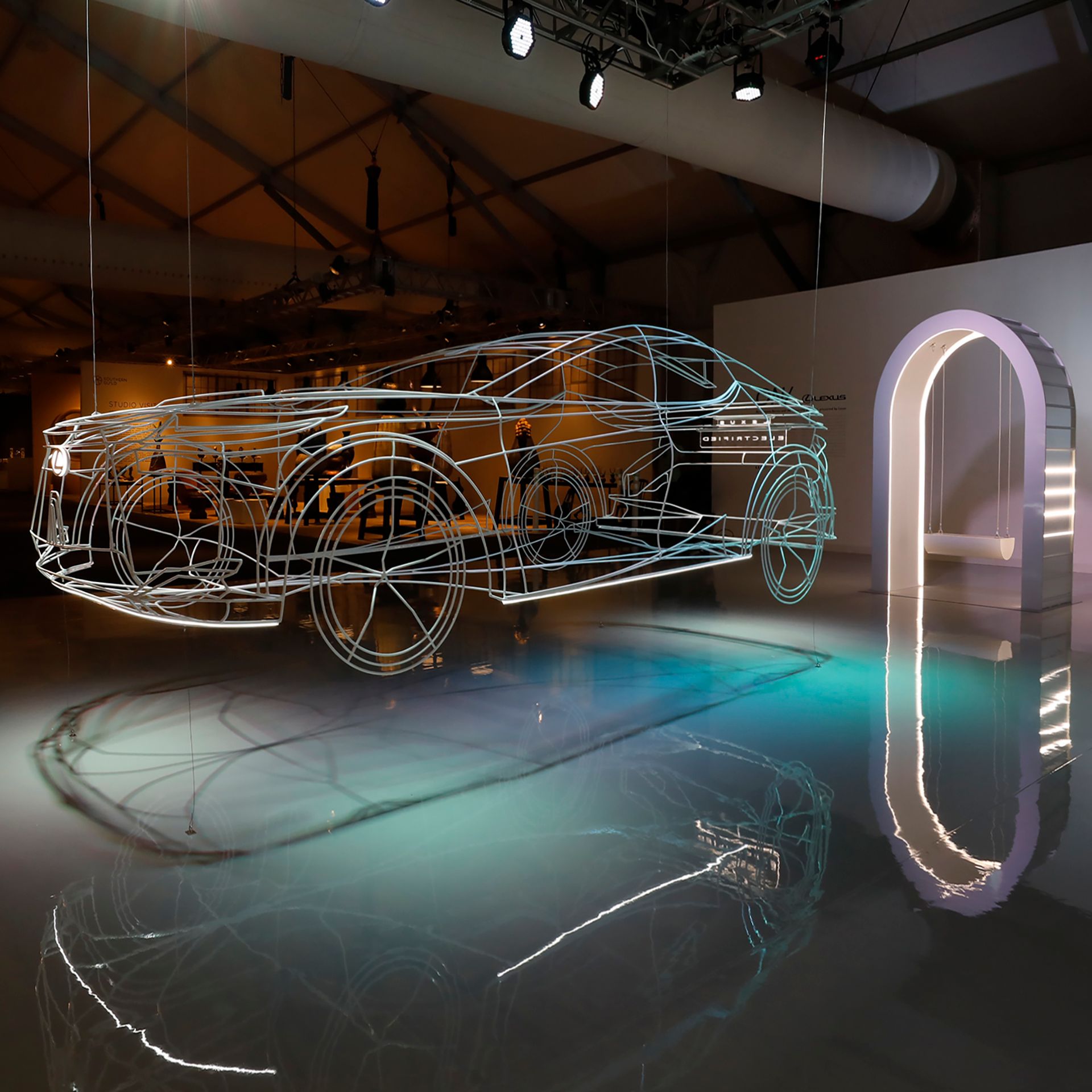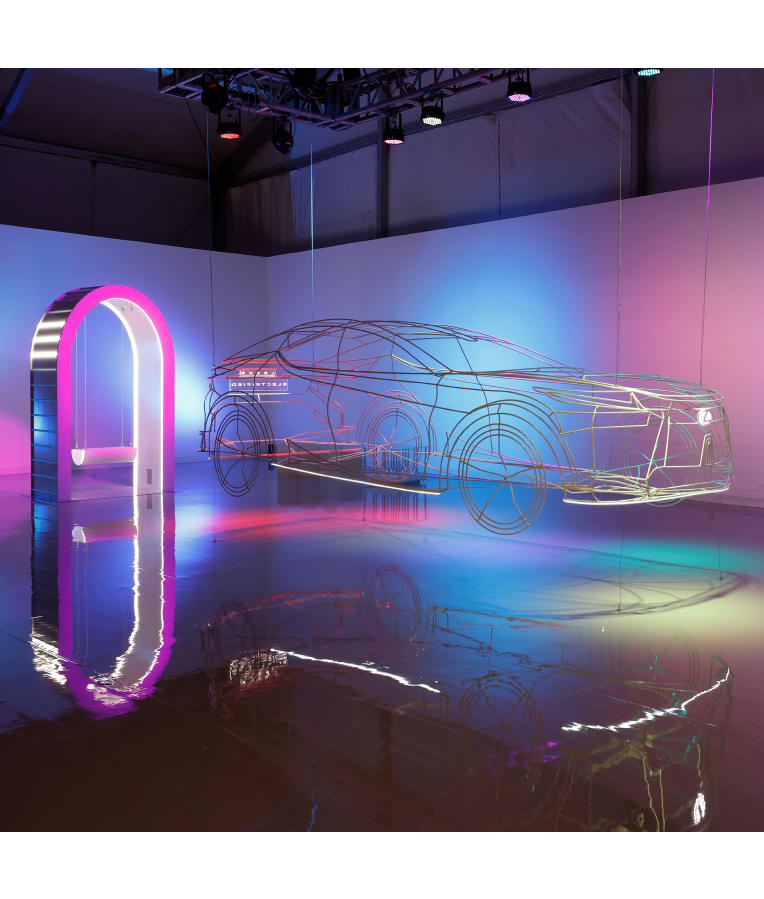 The installation is centered around a precisely-to-scale, three-dimensional sculptural rendition of the LF-Z Electrified Concept car rendered in steel and illuminated with embedded LED lighting; the frame of the car glows and is suspended just above the ground, a vision of a more sustainable future coming into focus. Two swings anchor the display, each suspended within illuminated arches in a nod to the classical architecture that is both foundational to the design of civic infrastructure and central to the University of Miami’s curriculum, alluding to a gateway between our present and the possibilities of the future.